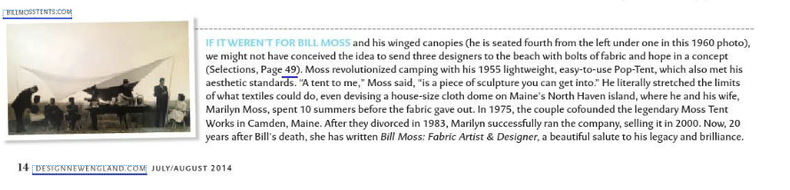 Todd Dalland (a friend of Bill's and admirer of his work, is also a tent designer and Fellow of the American Institute of Architects) “Bill Moss: Fabric Artist & Designer is one of the great American stories rooted in the postwar 50's whose triumphs inspire people from all around the world to a free-spirited, ingenious and eco-savvy way of living and working. In Moss' example, it's about bringing beauty and innovative technology to the lightweight shelters that populate our lifestyle and environment. The creativity and drive of one individual, Bill Moss, supported by his wife and partner Marilyn and a small group of very talented followers, challenged corporate America to make better shelter products by example. Ultimately, through the widespread popularity and sales of its artistic tents and shelters, Moss Inc become a part of corporate America—an exemplary one."